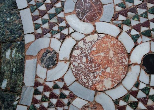 Particolare della decorazione musiva dell’atrio ideata dal barone Giorgio Franchetti © Blu Oscar