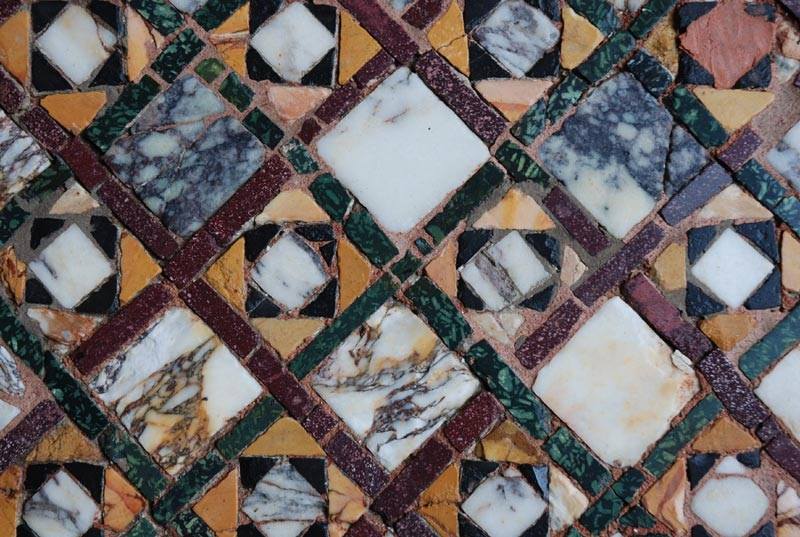 The mosaic is inspired by cosmaticque models and it is composed by ancient fragments of marbles. The drawing was created by the last owner of the Palace, baron Giogrio Franchetti, who realized it mostly by himself. Unfortunately he died in 1922, before the end of the work and he couldn’t enjoy its final splendor.